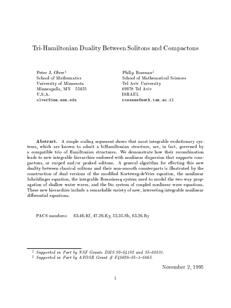 Peter J Olver And Philip Rosenau Tri Hamiltonian Duality Between Solitons And Compactons Pdf Soliton Nonlinear System